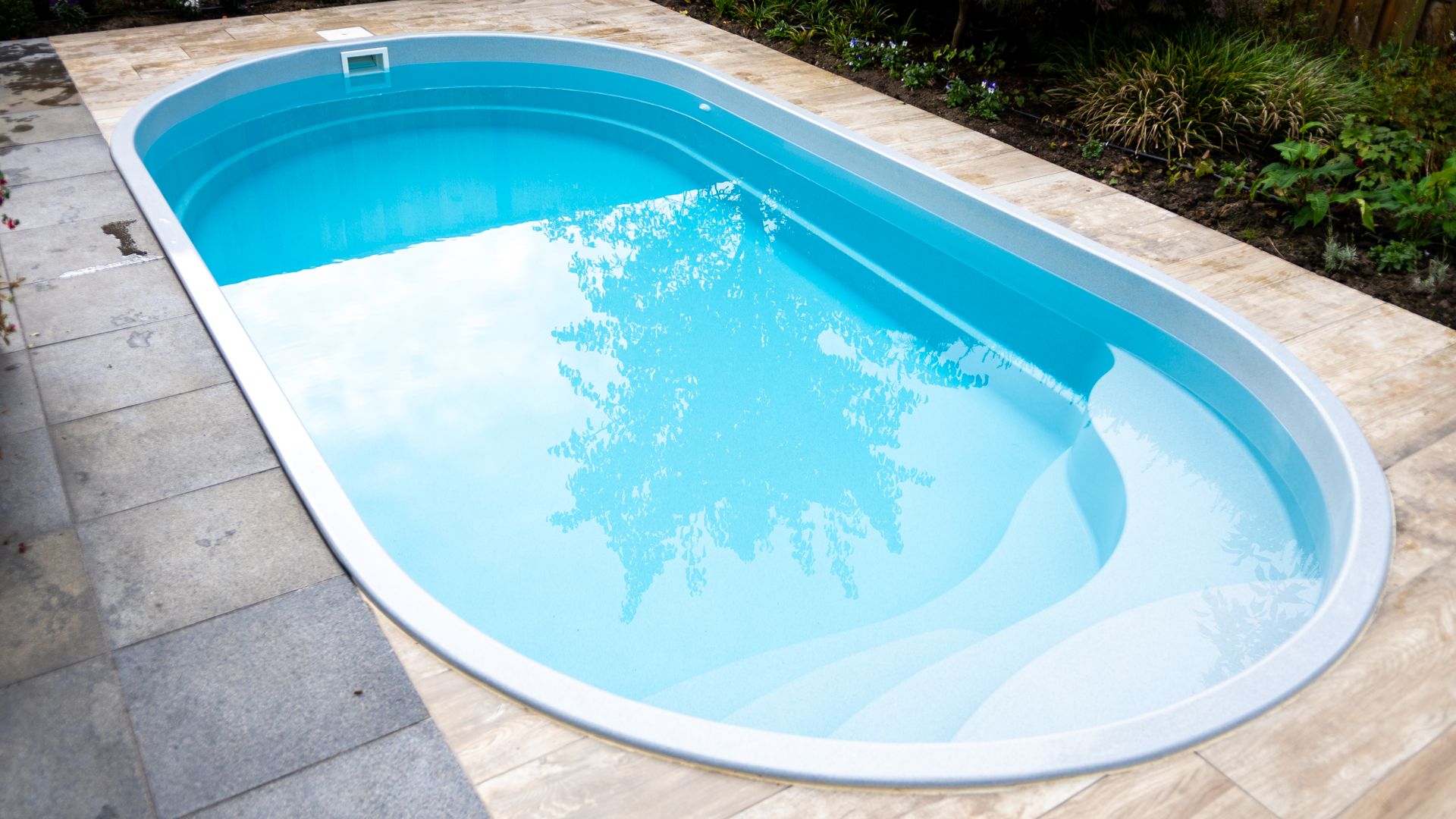 Grijs Cannes zwembad. Dit zwembad is voorzien van een warmtepomp, verlichting en automatische doseertechniek.