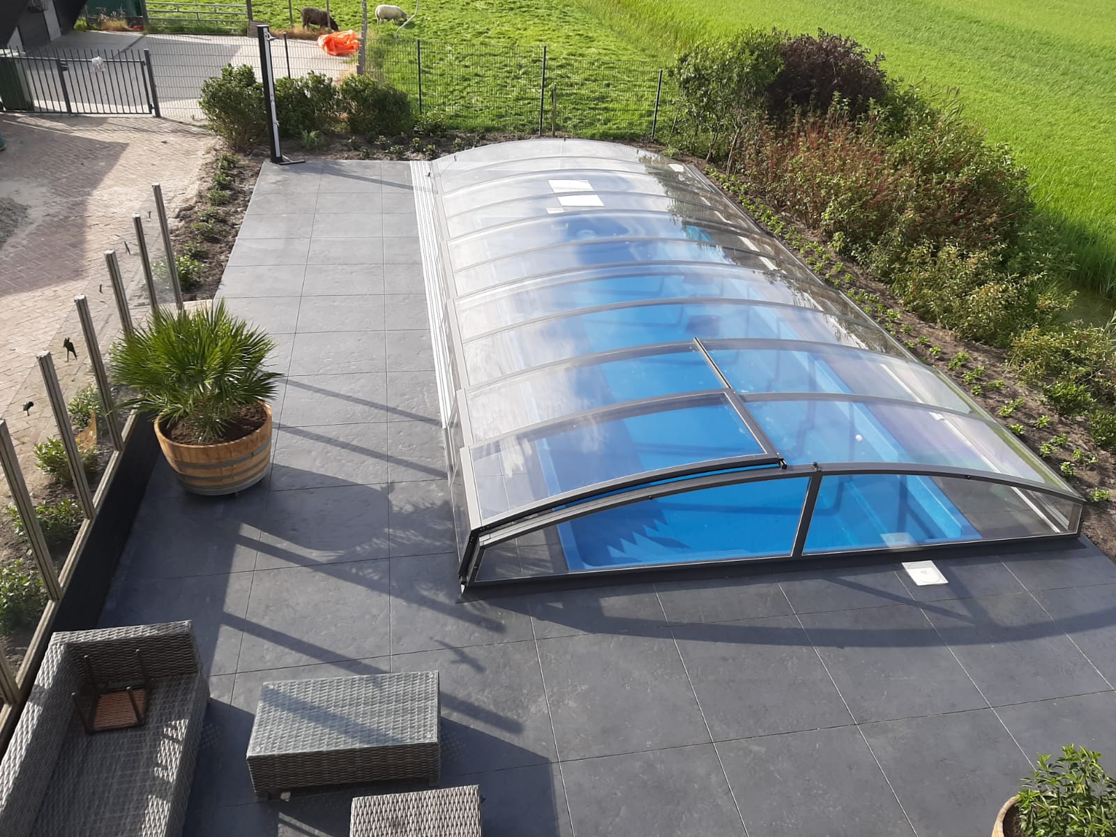 Grijs Gemini zwembad. Dit zwembad is voorzien van een warmtepomp , verlichting, automatische doseertechniek en Aquadeck lamellen.